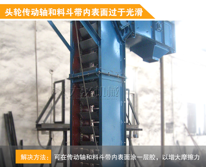 斗式提升機(jī)是利用料斗帶與頭輪傳動(dòng)軸間的摩擦力矩來(lái)進(jìn)行升運(yùn)物料的,料斗帶張力不夠,將導(dǎo)致料斗帶打滑。